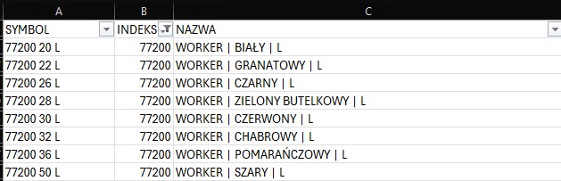Kolumna A – SYMBOL – symbol danego produktu w schemacie INDEKS KOLOR ROZMIAR