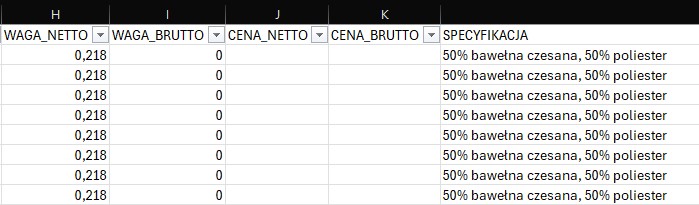 Kolumna K – CENA_BRUTTO – w przypadku pliku bez cennika kolumna pozostaje pusta