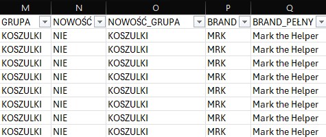 Kolumna O – NOWOŚĆ_GRUPA – w przypadku nowości widnieje GRUPA, NOWOŚĆ