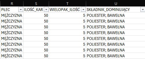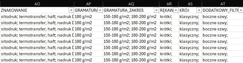 Kolumna AQ – GRAMATURA_ZAKRES – umożliwia filtrowanie produktu po danym zakresie gramatury