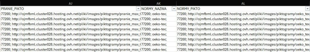 Kolumna AE – WYMIARY – tabela rozmiarowa produktu, w jednej komórce znajdują się 3 wiersze danych. W pojedynczym wierszu dane rozdzielone są średnikami, natomiast wiersze podzielone są znakiem nowej linii (ZNAK(10) )